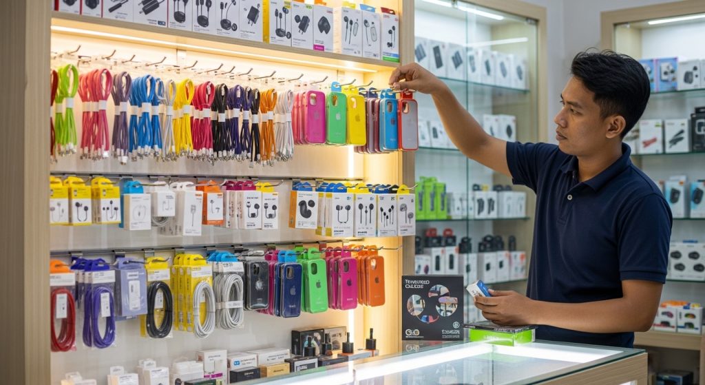 Banyak konter yang terlihat profesional hanya karena produk disusun dengan rapi dan mudah dilihat oleh pelanggan. Aksesoris seperti charger, kabel data, headset, dan tempered glass bisa ditata dengan sistem display yang jelas.